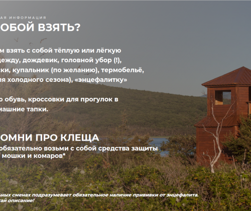 - Заповедник организует транспорт от Тернея до места работ, экскурсии и предоставляет жильё.