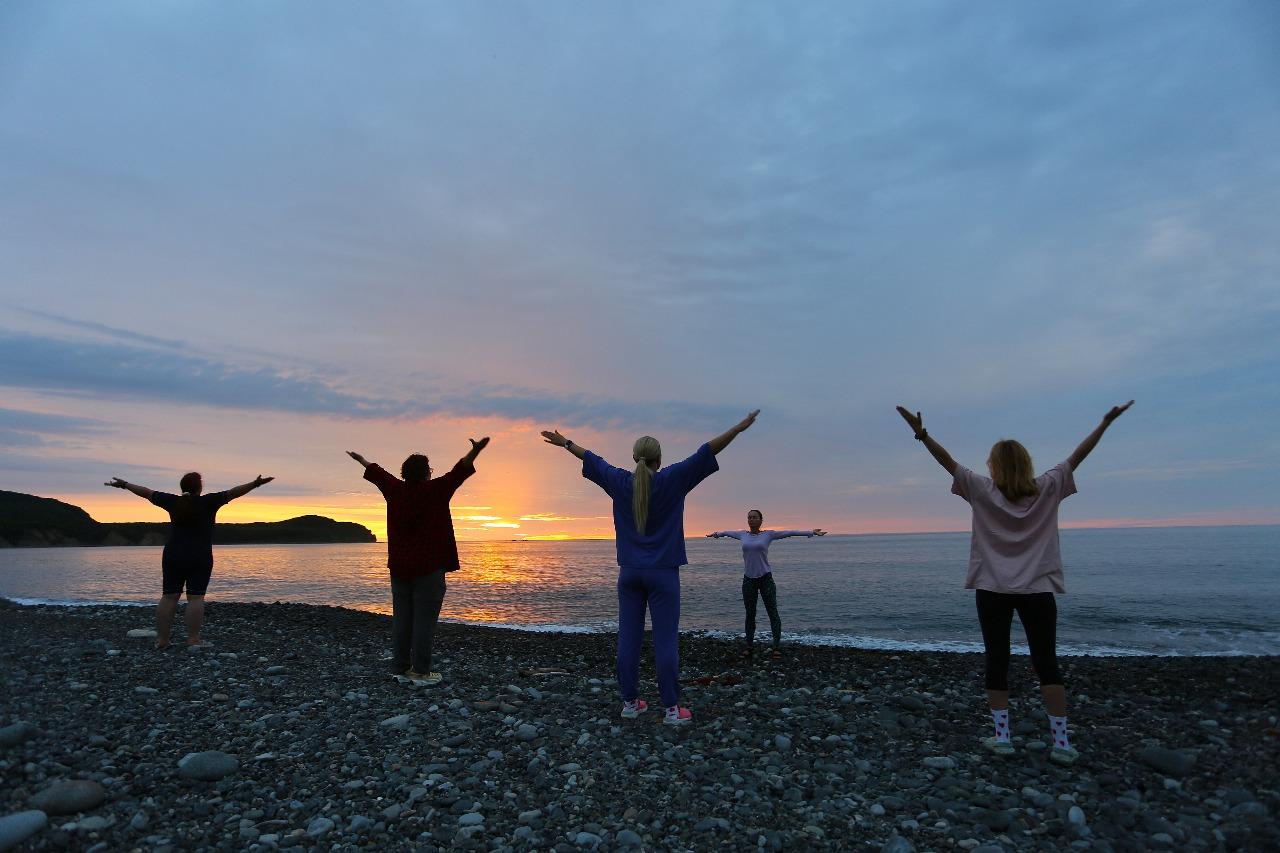 День в заповеднике начинается в семь утра с полуторачасовой практики. Утренние занятия бодрящие, интенсивные, заряжающие. После завтрака — выход на один из заповедных экскурсионных маршрутов. Это может быть небольшая прогулка к тюленям-ларгам на мысе Северный, интенсивное восхождение на гору Лысую или медитативный многочасовой поход к лагунным озерам Благодатному и Голубичному.